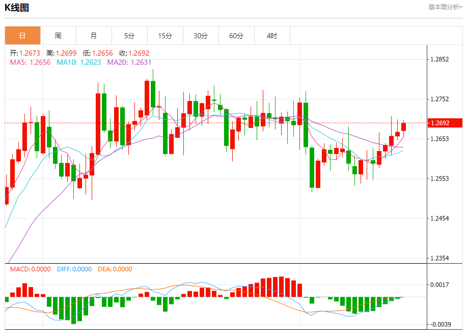 汇价高见1.2699,低见1.2656。上一交易日,汇价收于1.2670。