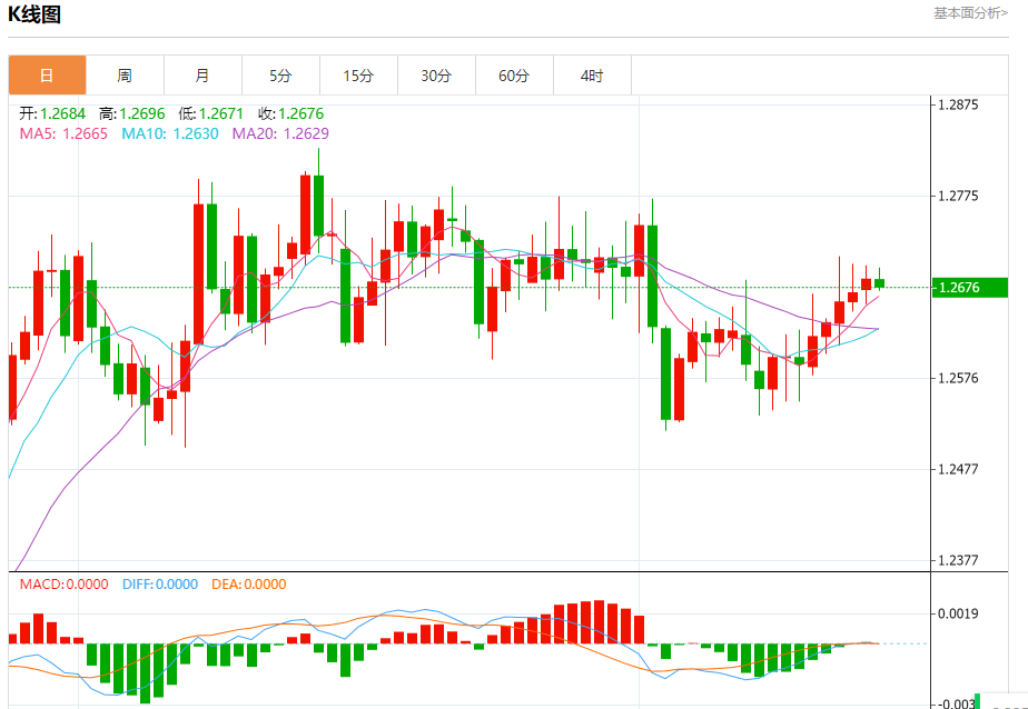 汇价高见1.2696,低见1.2671。上一交易日,汇价收于1.2684。