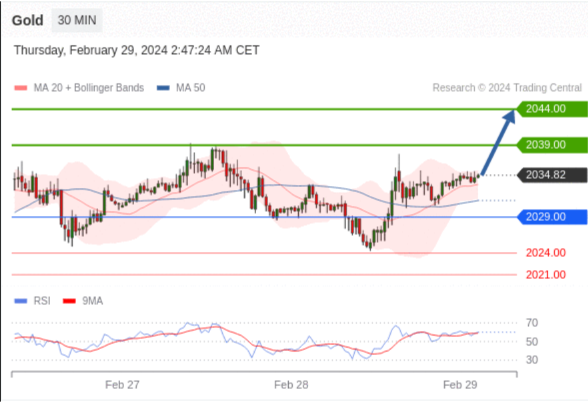 在 2029.00 之上,看涨,目标价位为 2039.00 ,然后为 2044.00 。