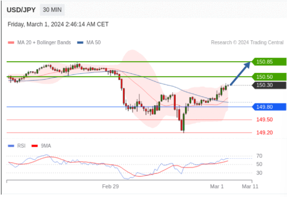 在 149.80 之上,看涨,目标价位为 150.50 ,然后为 150.85 。