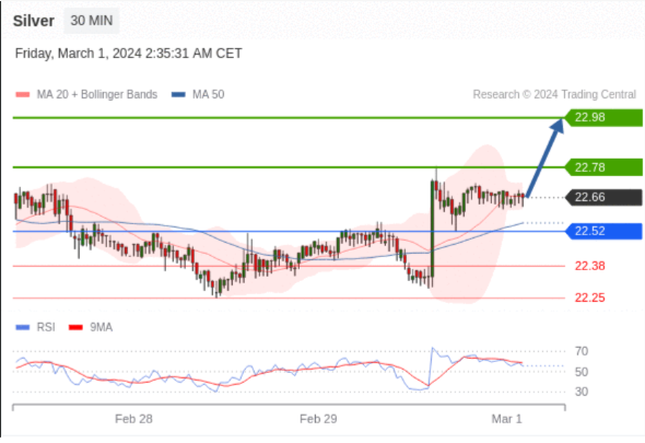 在 22.52 之上,看涨,目标价位为 22.78 ,然后为 22.98 。