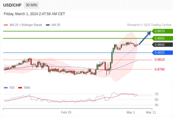 在 0.8825 之上,看涨,目标价位为 0.8855 ,然后为 0.8870 。