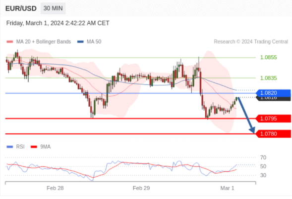 在 1.0820 之下,看跌,目标价位为 1.0795 ,然后为 1.0780 。