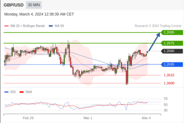 在 1.2635 之上,看涨,目标价位为 1.2675 ,然后为 1.2695 。