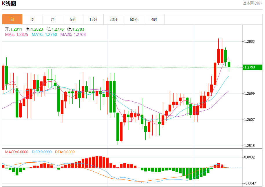 汇价高见1.2823,低见1.2776。上一交易日,汇价收于1.2812。