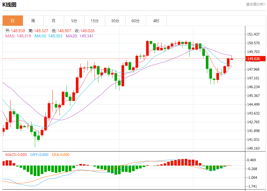 汇价高见149.328,低见148.905。上一交易日,汇价收于149.054。