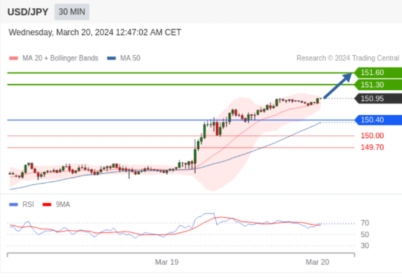 在 150.40 之上,看涨,目标价位为 151.30 ,然后为 151.60 。