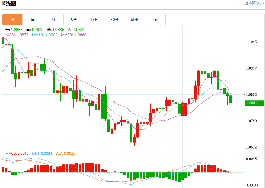 汇价高见1.0872,低见1.0836。上一交易日,汇价收于1.0865。