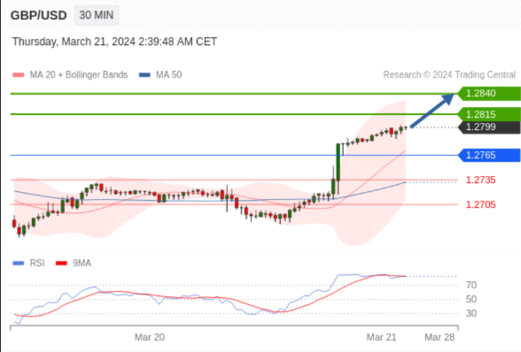 在 1.2765 之上,看涨,目标价位为 1.2815 ,然后为 1.2840 。