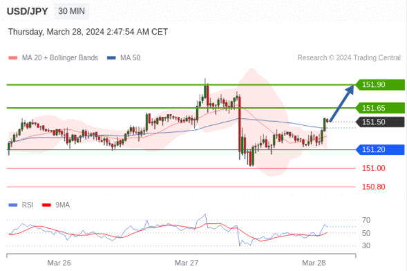 在151.20之上,看涨,目标价位为151.65,然后为151.90。