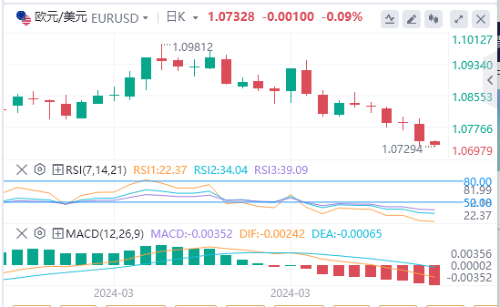 欧元/美元则大幅下跌,此前美联储主席鲍威尔表示,由于经济增长依然强劲,通胀高于目标,没有必要急于降息。现在,在中期出现任何逆转之前,未来几个交易日欧元/美元可能会测试1.07。