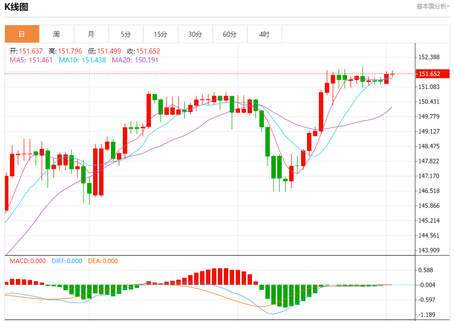 汇价高见151.796,低见151.499。上一交易日,汇价收于151.639。