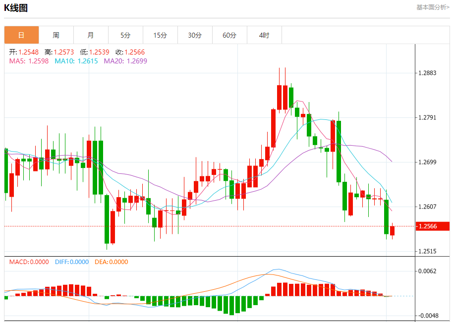 汇价高见1.2573,低见1.2539。上一交易日,汇价收于1.2551。