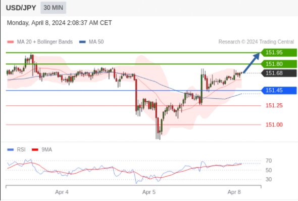 在 151.45 之上,看涨,目标价位为 151.80 ,然后为 151.95 。