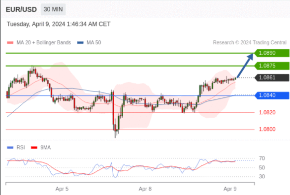 在 1.0840 之上,看涨,目标价位为 1.0875 ,然后为 1.0890 。