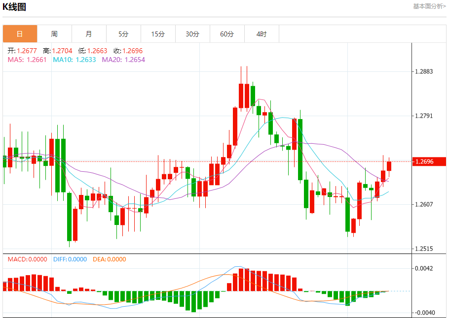 汇价高见1.2704,低见1.2663。上一交易日,汇价收于1.2677。