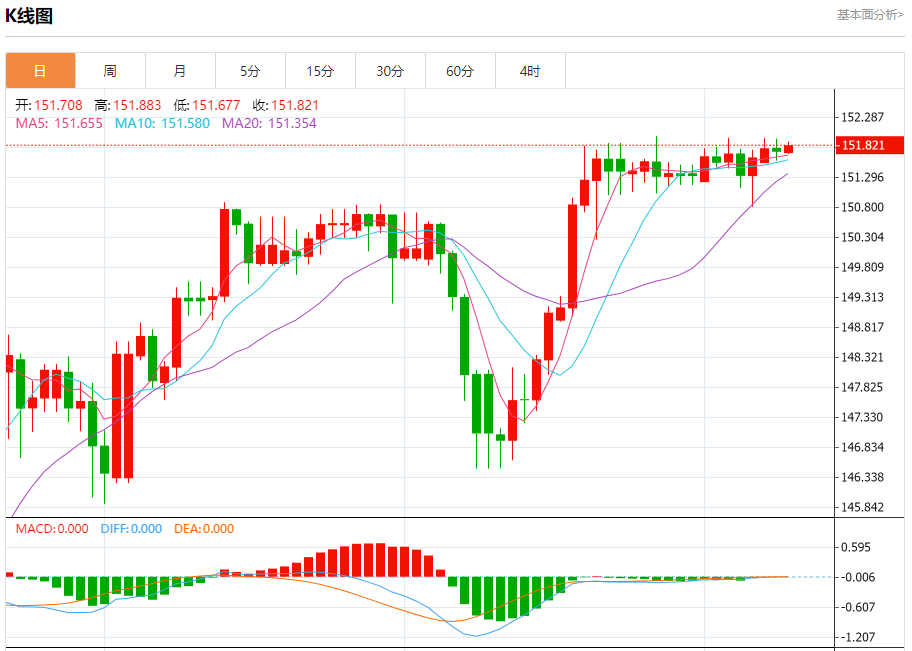 汇价高见151.883,低见151.677。上一交易日,汇价收于151.730。