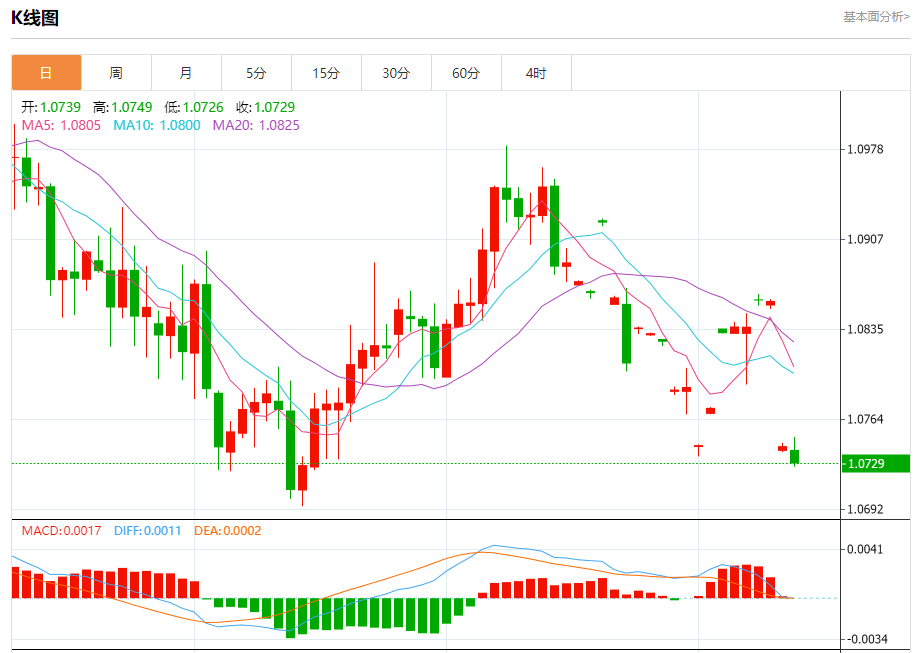 汇价高见1.0749,低见1.0726。上一交易日,汇价收于1.0742。