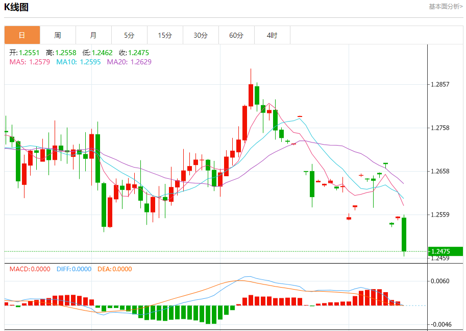 汇价高见1.2558,低见1.2462。上一交易日,汇价收于1.2553。