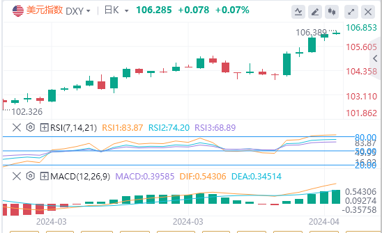 周一,美国公布3月零售销售增幅超出预期,美元指数走强。追踪美元兑六种主要货币的ICE美元指数周一上涨0.14%,报106.19。