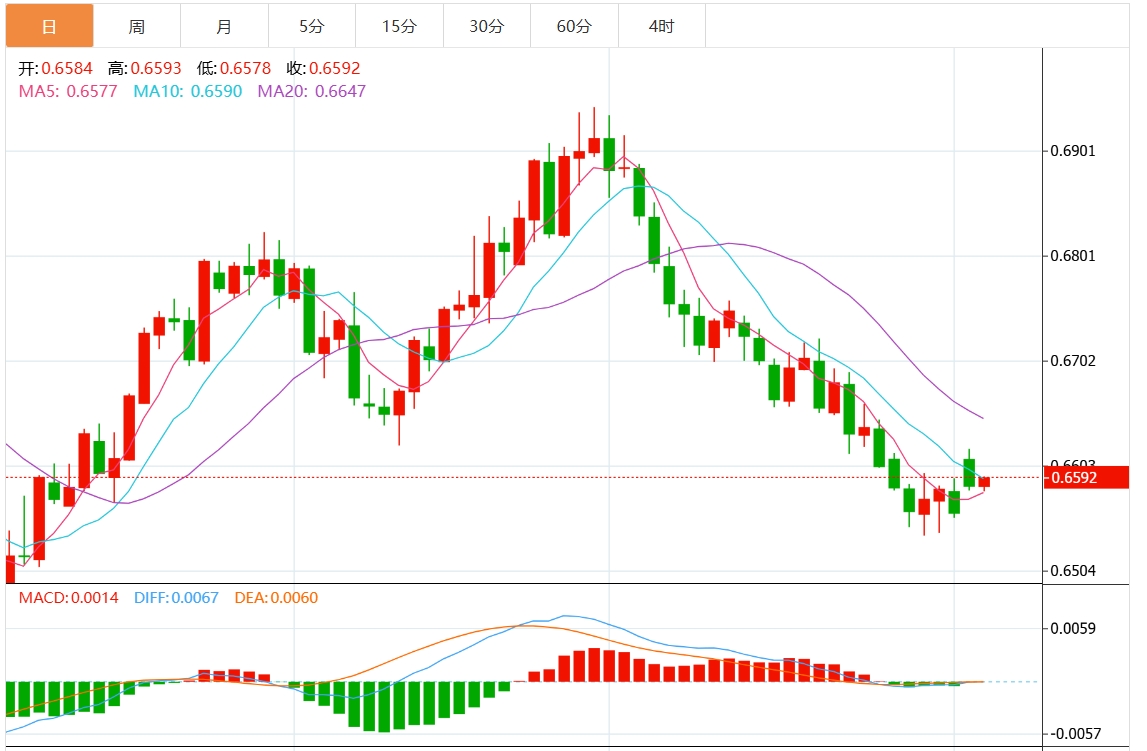 澳元/美元周五在 0.6660 附近交易,在日线图上显示出从看跌到看涨的势头。该货币对已升至 9 天和 14 天指数移动平均线 (EMA) 上方,表明短期上涨势头。此外,14 天相对强弱指数 (RSI) 已突破 50 关口,表明持续的看涨情绪。