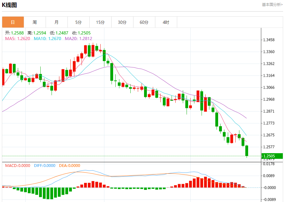 汇价高见1.2594,低见1.2487。上一交易日,汇价收于1.2588。