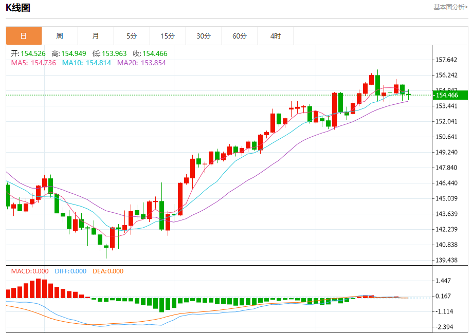 汇价高见154.949,低见153.963。上一交易日,汇价收于154.530。