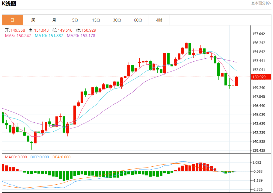 汇价高见151.043,低见149.524。上一交易日,汇价收于149.579。