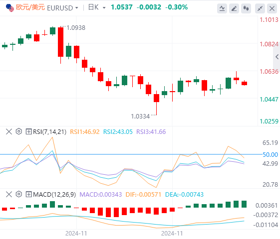 预计欧洲央行(ECB)将在周四的2024年最后一次政策会议上进行今年的第四次降息。分析师预计欧洲央行将坚持其依赖数据的指引,重申其“不会预先承诺特定的利率路径”。然而,欧洲央行行长拉加德的新闻发布会可能会提供有关利率前景的一些暗示。欧洲央行政策制定者的任何鸽派言论都可能令欧元(EUR)兑美元承压。