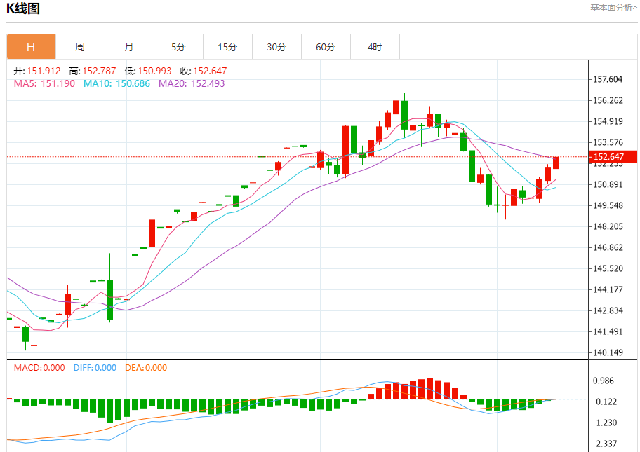 汇价高见152.787,低见150.982。上一交易日,汇价收于151.957。