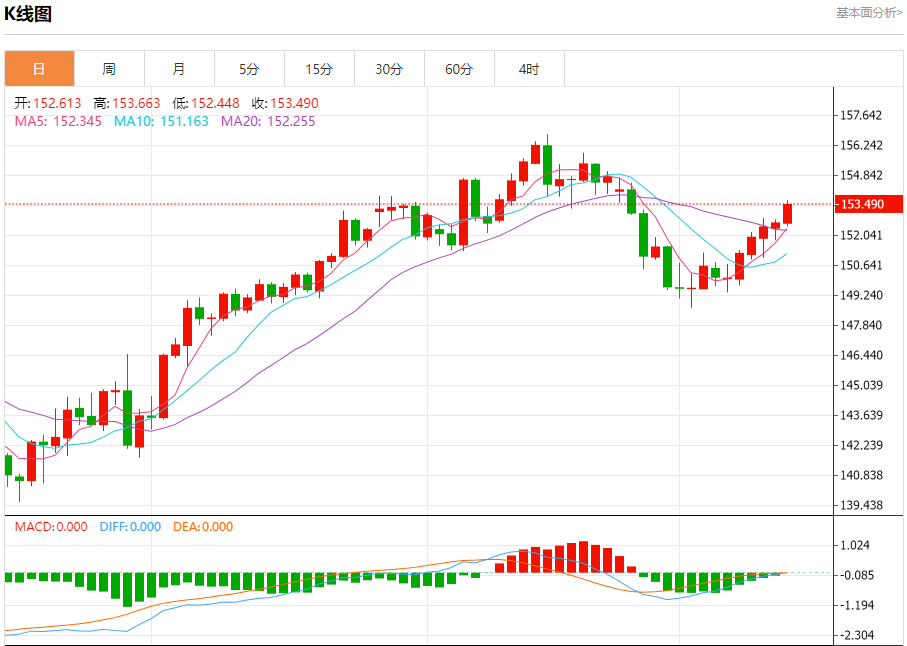 汇价高见153.663,低见152.448。上一交易日,汇价收于152.628。