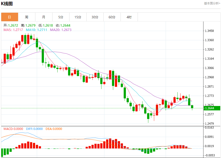 汇价高见1.2679,低见1.2619。上一交易日,汇价收于1.2672。