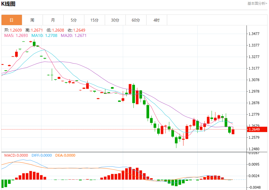 汇价高见1.2671,低见1.2608。上一交易日,汇价收于1.2621。