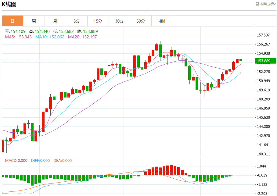 汇价高见154.340,低见153.682。上一交易日,汇价收于154.097。
