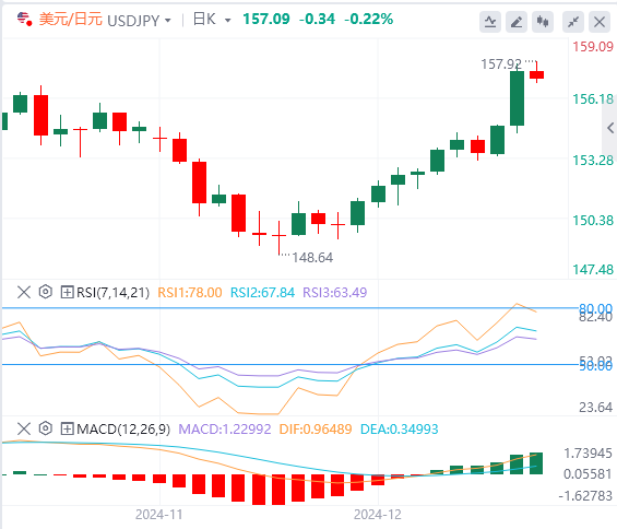 美元/日元较此前预期更早地触及157,汇价甚至一度上涨到157.929的高点,之后又有所回落。日本当局可能会干预,以保护日元免于大幅贬值,但如果美元指数继续涨向110,那么美元/日元也可以在未来几个交易日升向160、甚至更高水平。从眼下开始的走势现在看起来有点不确定。