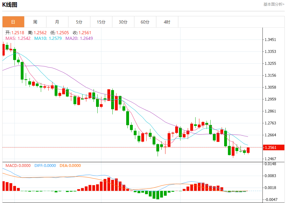 汇价高见1.2562,低见1.2505。上一交易日,汇价收于1.2519。