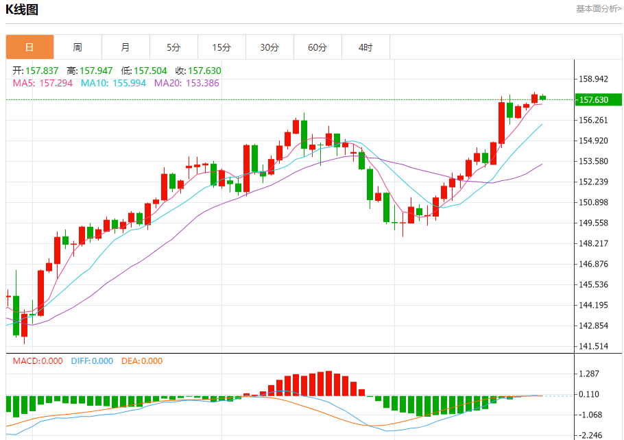 汇价高见157.947,低见157.504。上一交易日,汇价收于157.926。