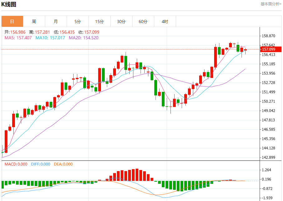 汇价高见157.281,低见156.435。上一交易日,汇价收于157.312。