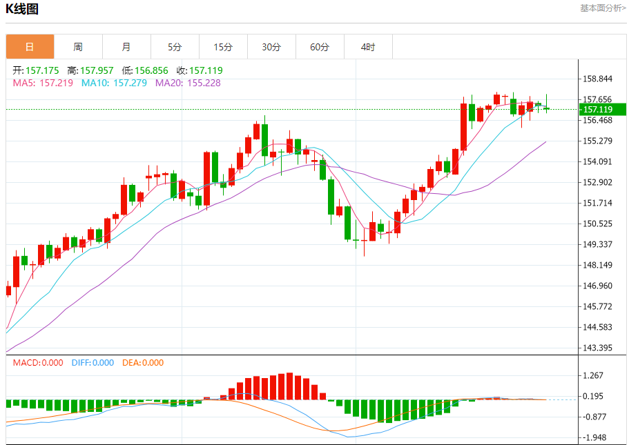 汇价高见157.957,低见156.856。上一交易日,汇价收于157.303。