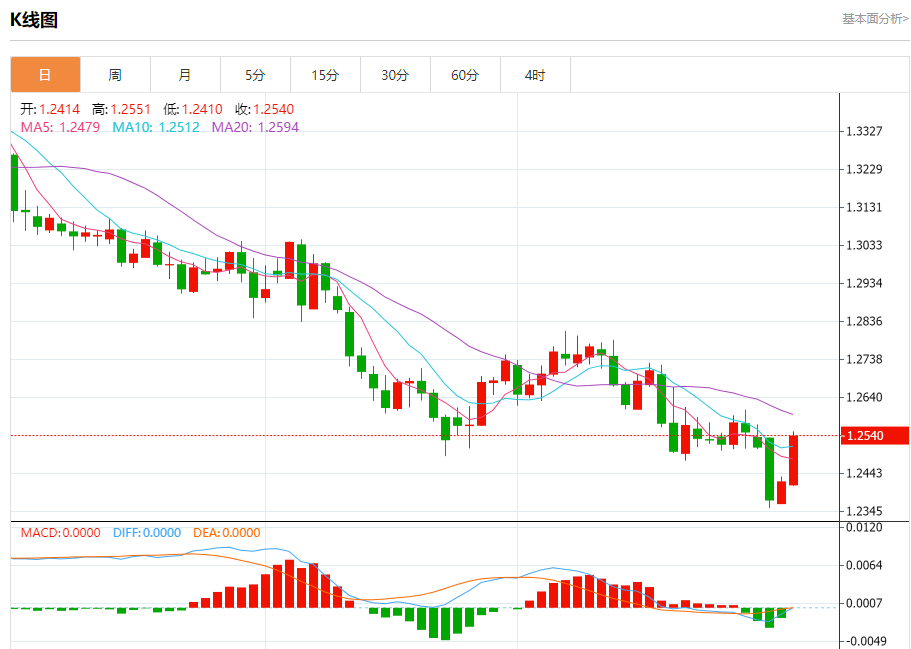 汇价高见1.2551,低见1.2410。上一交易日,汇价收于1.2421。