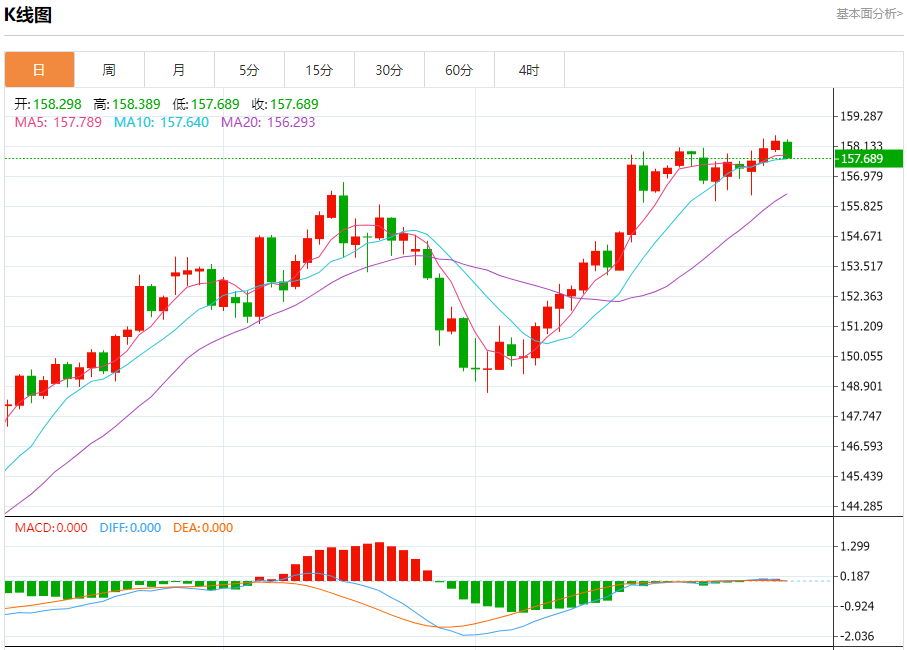 汇价高见158.389,低见157.737。上一交易日,汇价收于158.335。