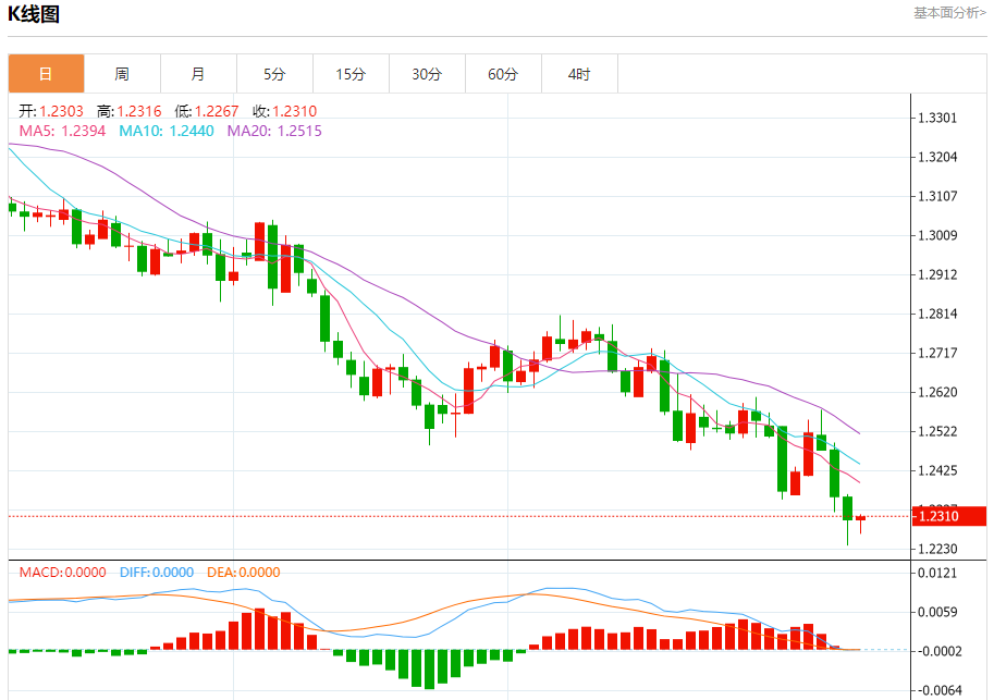 汇价高见1.2316,低见1.2267。上一交易日,汇价收于1.2303。