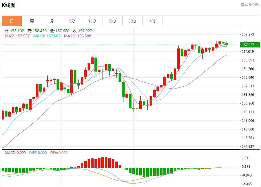 汇价高见158.439,低见157.620。上一交易日,汇价收于158.106。