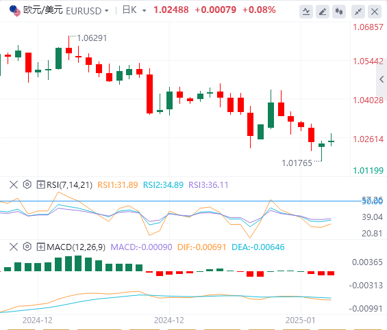 欧元/美元可能在九日指数移动均线(EMA)1.0290附近遇到主要阻力,随后是14日EMA的1.0318。突破这些水平可能会瞄准下降通道的上边界1.0400,进一步上涨可能达到12月6日的两个月高点1.0630。