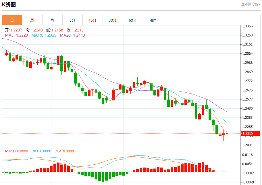 汇价高见1.2240,低见1.2155。上一交易日,汇价收于1.2214。