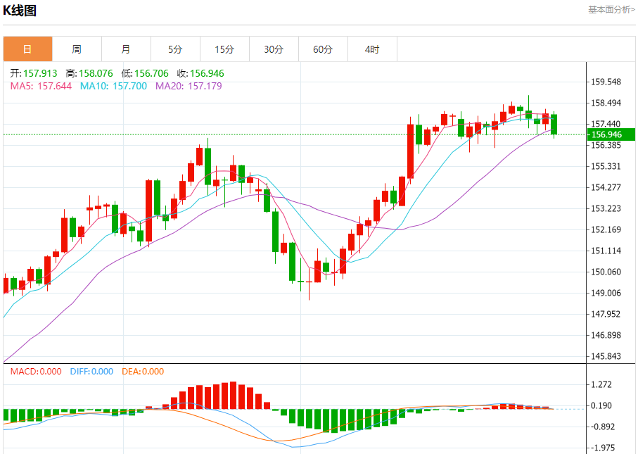 汇价高见158.077,低见156.703。上一交易日,汇价收于157.962。