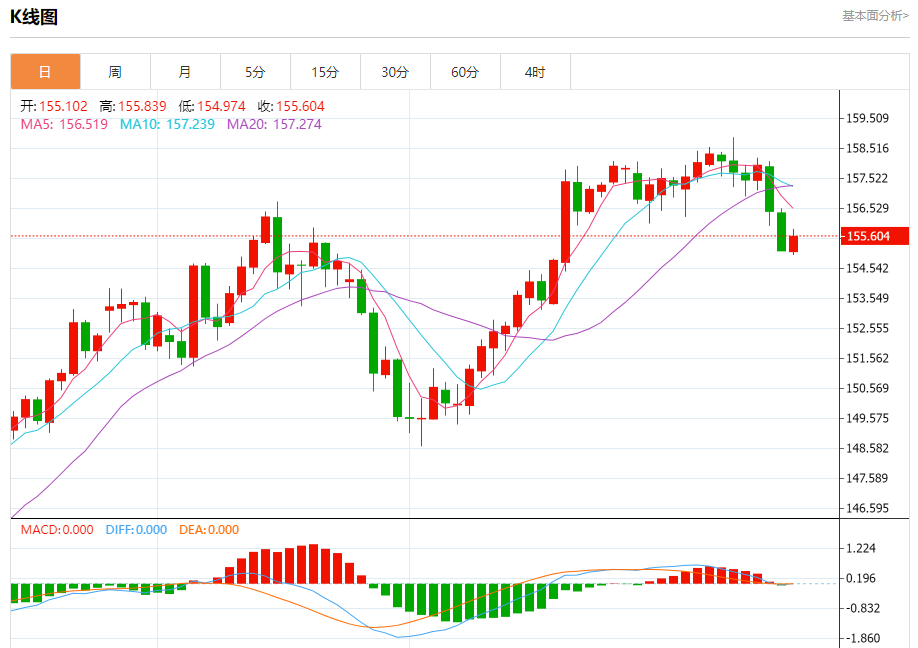 汇价高见155.839,低见154.974。上一交易日,汇价收于155.125。