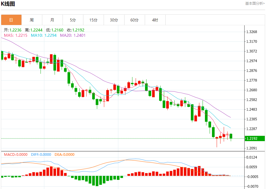汇价高见1.2244,低见1.2160。上一交易日,汇价收于1.2234。