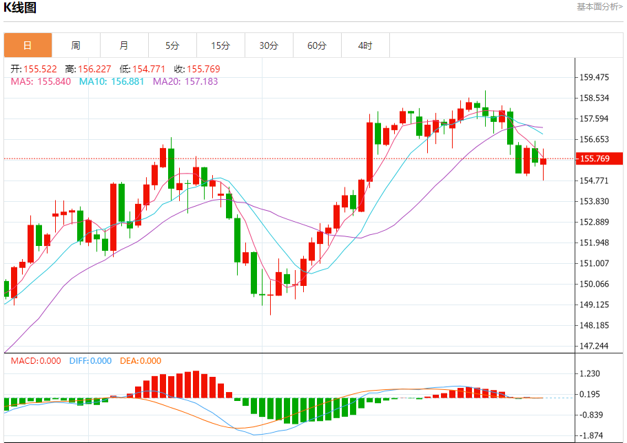 汇价高见156.227,低见154.771。上一交易日,汇价收于155.613。