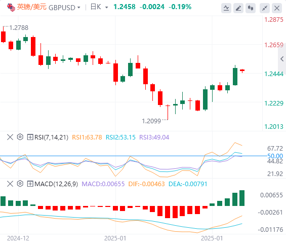利好方面,立即阻力位在1.2500-1.2510区域,代表心理关口和布林带上限。果断突破该水平可能为1.2551铺平道路,即1月6日的高点。下一个上行障碍在1.2607,即2024年12月30日的高点